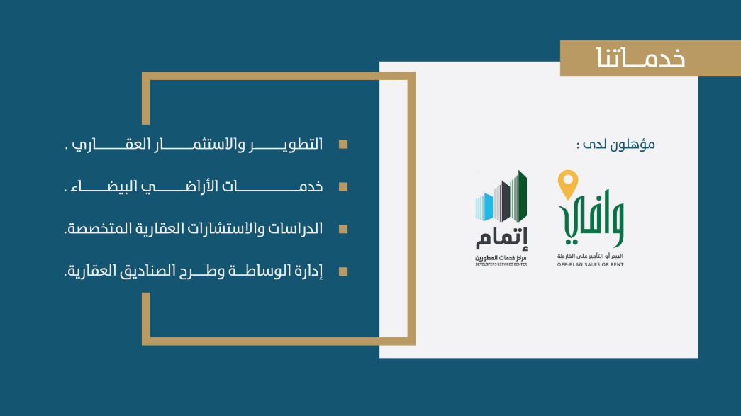 نساعد ملاك الأراضي البيضاء على تعظيم قيمتها من خلال حلول تطويرية متكاملة واستشارات احترافية تتماشى مع الأنظمة.